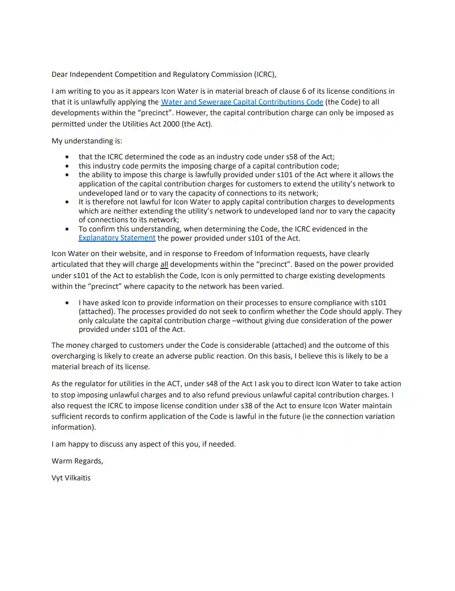 As Icon Water began to impose charges on people wanting to place extensions or secondary residences on their blocks, appeals to relevant bodies began in order to gain more information on the legality of this charge and the source of Icon’s power’s in imposing this charge.