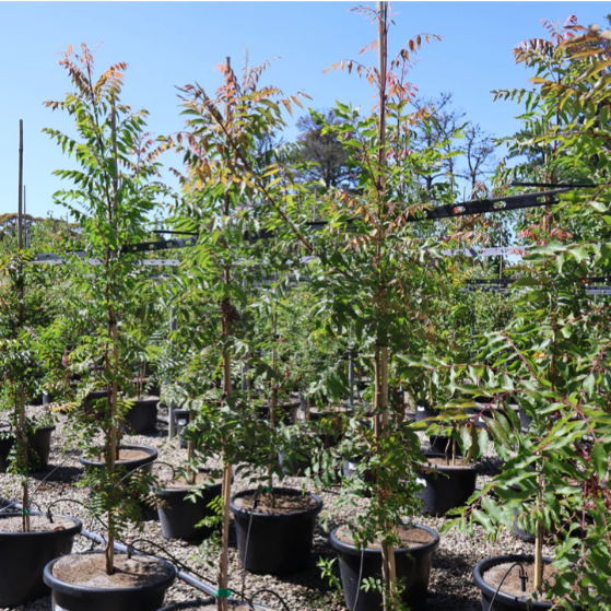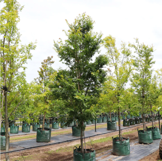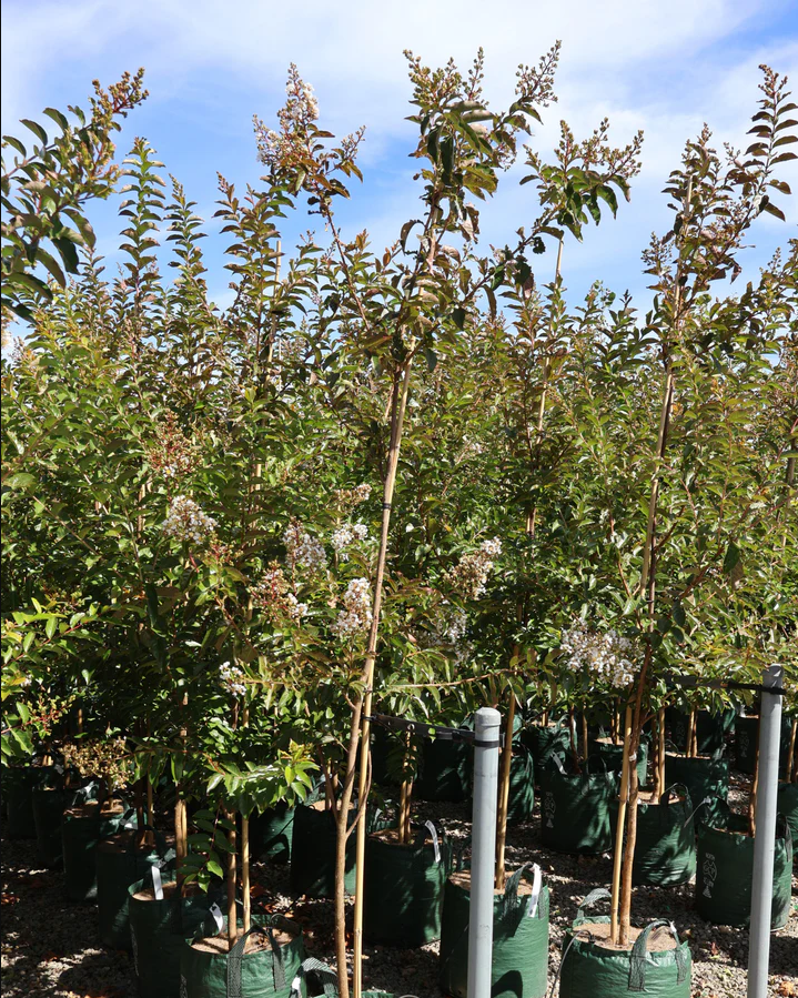 The Crepe Myrtle 'Natchez' is commonly used as a decorative tree in landscapes and gardens, providing year-round interest with its beautiful blooms, attractive bark, and colorful foliage. The leaves of the Crepe Myrtle 'Natchez' are glossy and dark green, providing a beautiful backdrop to its stunning blooms. The tree's smooth, exfoliating bark comes in shades of grey, adding additional interest to its appearance.